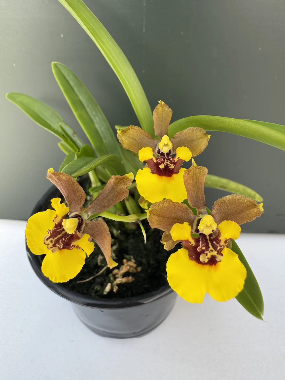 Τα άνθη είναι σχετικά μικρά — περίπου 4–4.5 cm — με πλούσιο, συχνά “σκούρο” φόντο στα πέταλα/sepals και με έντονο χρυσό/κίτρινο “χείλος” (lip).